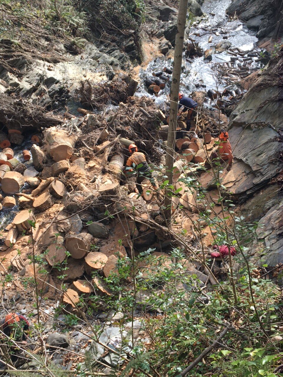 Les embâcles et les bois morts ont été évacués (et valorisés en papèterie ou en bois énergie), ou broyés sur place. Lorsque les secteurs n’étaient pas accessibles pour les engins, les bois ont été billonnés en longueurs de 50 cm ou de 1 m. Sur ces secteurs, il n’y a pas d’autres options techniques car l’évacuation manuelle rendrait prohibitif la réalisation de travaux. Cette dimension permet aux billons de bois de franchir les ouvrages.